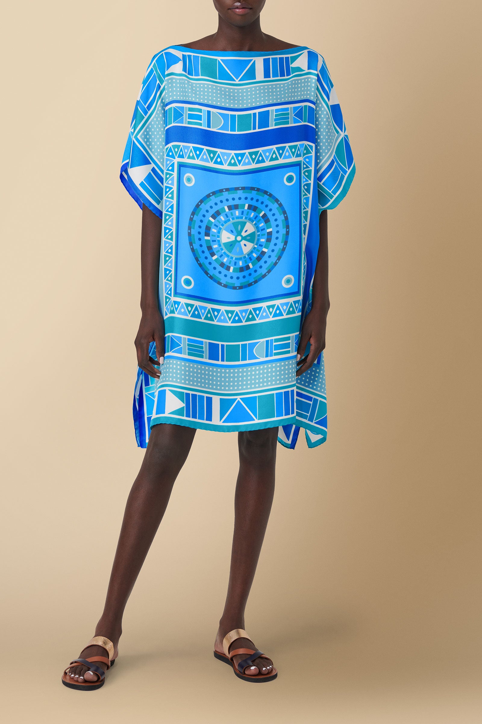 Elevate your summer style with our beadwork printed silk twill kaftan dress coverup in water-repellent silk twill. This enchanting kaftan coverup combines the elegance of silk twill with the practicality of water-repellent fabric, making it the perfect choice for beach days and poolside lounging. The exquisite Maasia beadwork-inspired printed kaftan dress in shades of blue adds a touch of sophistication, creating a mesmerizing visual appeal.