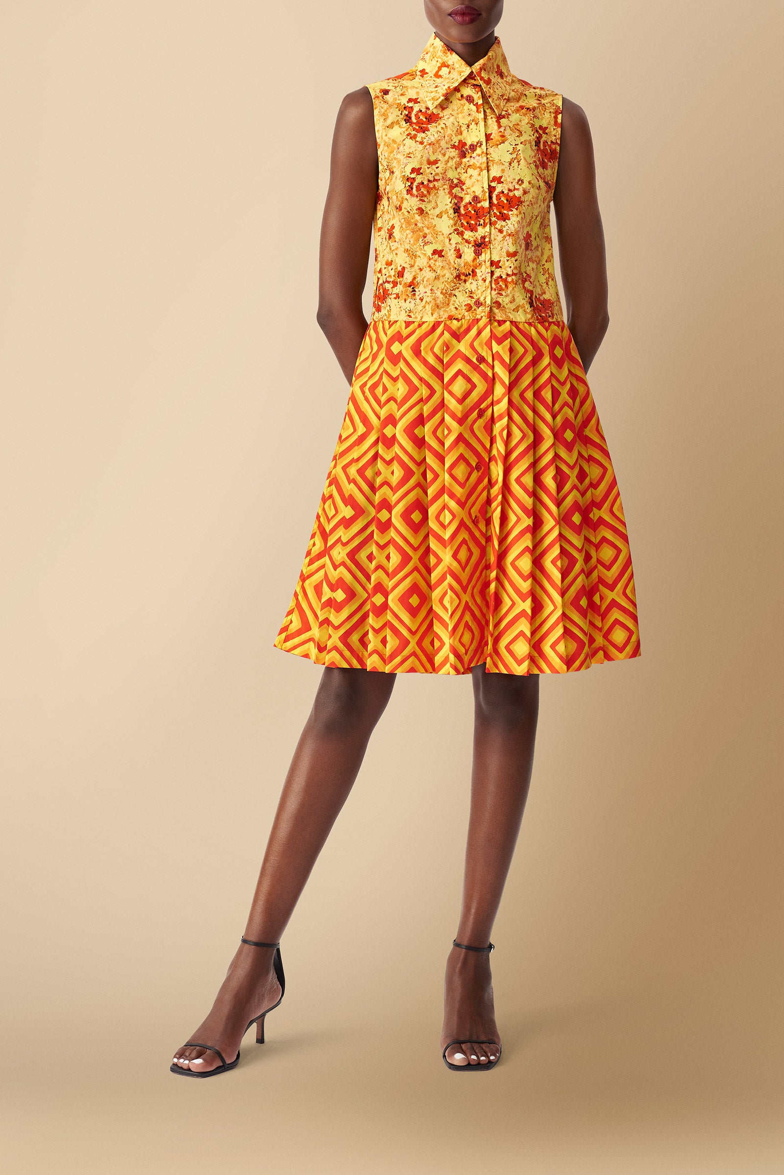 The recontextualized, abstract floral, and geometric mixed prints in vibrant colors draw inspiration from historic floral and geometric designs. The dress is designed with a sleeveless, shirt-style bodice and a pleated, flowy skirt that creates beautiful movement as you walk. Offering a unique blend of Italian craftsmanship, textile heritage, and elevated cosmopolitan design, this dress adds effortless sophistication to any closet.