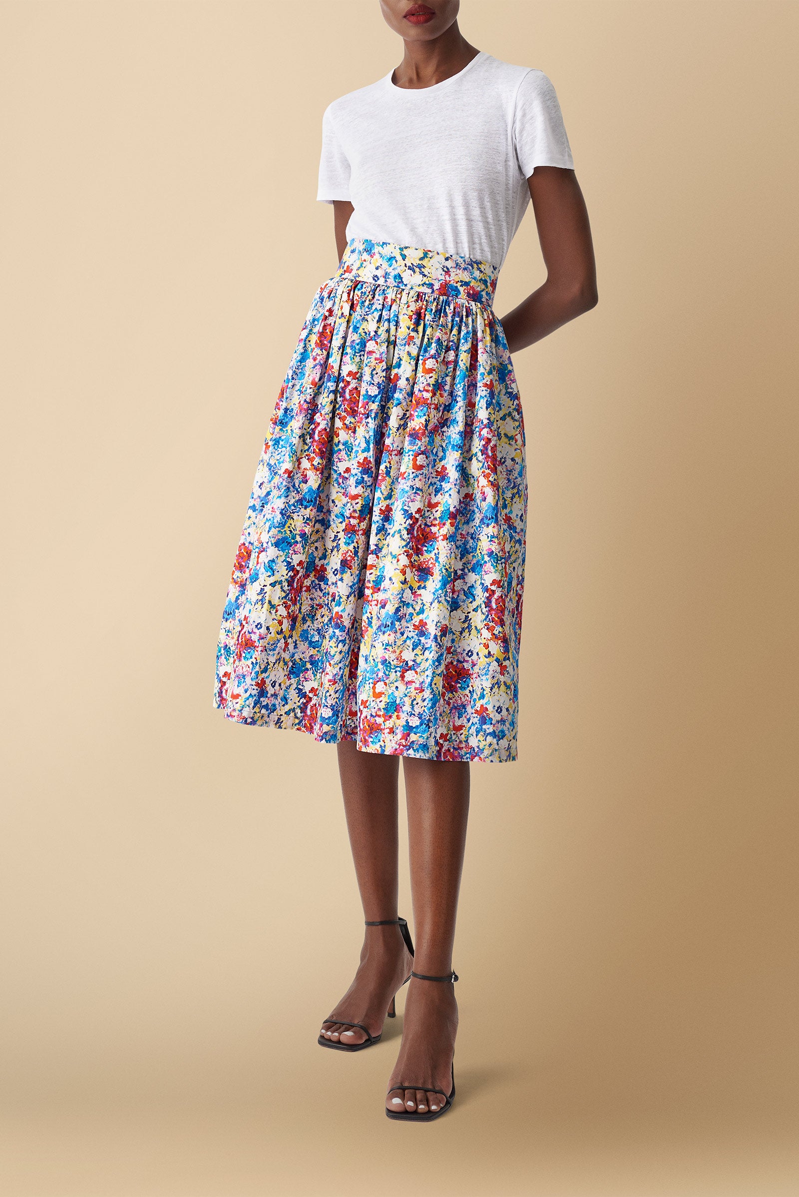 Njeri Floral Printed Midi Skirt in Cotton Poplin in Blue